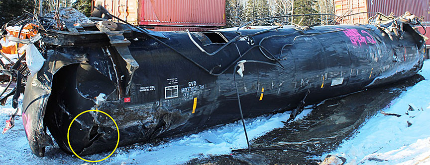 - Le 26e wagon (GATX 200483), un wagon-citerne de MD chargé de propane odorisé, s'est immobilisé sur le côté, au bas d'un remblai. Le wagon a été percuté sur le bout A et le bord supérieur droit de la tête de citerne a été perforé. La perforation mesurait environ 30 cm de long sur 60 cm de haut. Une fissure d'environ 30 cm de long s'étendait vers le bas depuis le coin inférieur gauche de la perforation.
