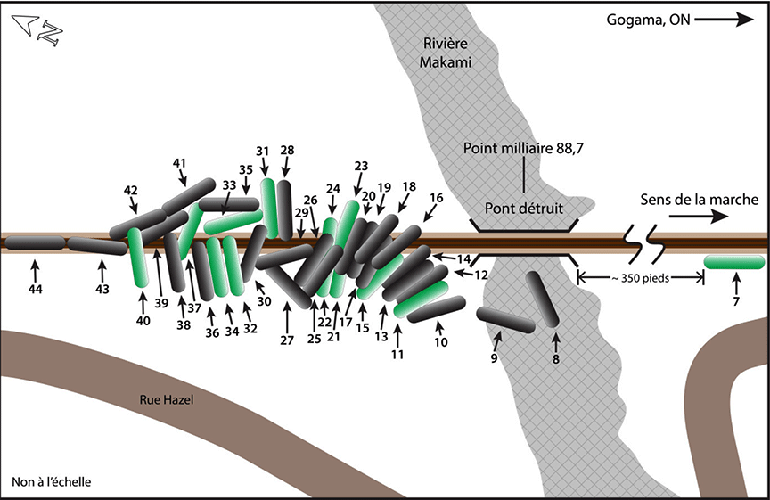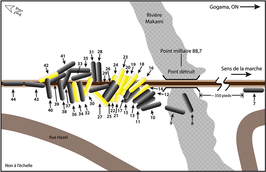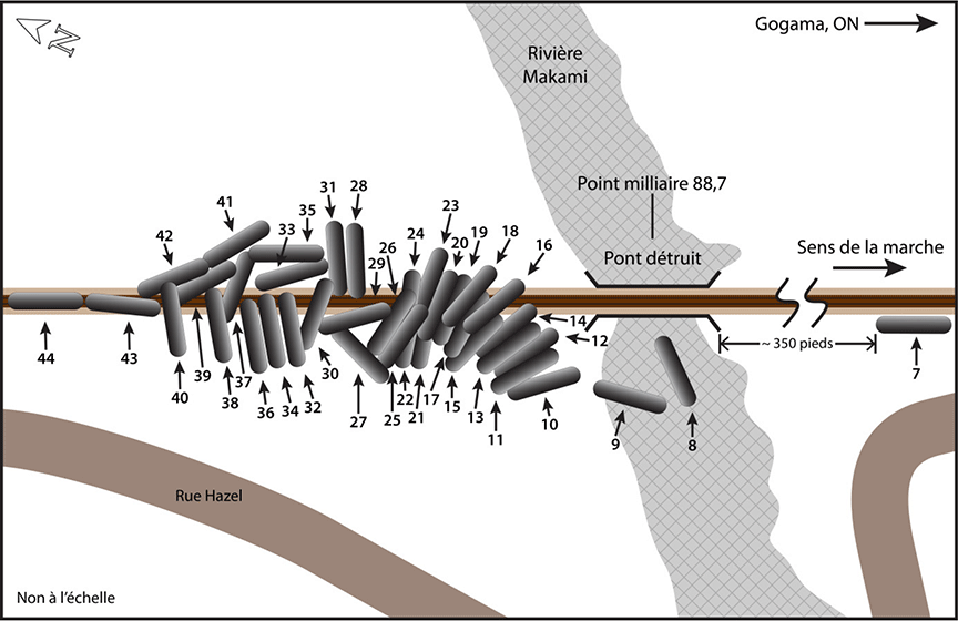 Les wagons 6 à 44 du train (39 wagons-citernes) ont déraillé (figure 2). Le 6e wagon (VMSX 310431) a franchi le pont et la rivière et a déraillé debout du côté sud de la voie. Par la suite, on a remis ce wagon sur les rails et retiré celui-ci des lieux du déraillement. L'extrémité menée du 7e wagon (VMSX 310442) a heurté le côté sud de la structure du pont et a dévalé le remblai du côté sud de la voie à environ 350 pieds à l'est du pont. Son robinet de vidange par le bas s'est rompu et a laissé fuir du produit. Le 8e wagon (VMSX 311916) a violemment heurté le pont et s'est immobilisé dans la rivière du côté sud du pont avec des pièces appartenant à 5 autres wagons. La plupart des wagons qui ont déraillé étaient mis en portefeuille sur l'approche ouest du pont et ont dévalé le remblai du côté sud de la voie. Les 2 derniers wagons qui ont déraillé, c'est-à-dire les 43e et 44e wagons (VMSX 310060 et VMSX 311681), se sont immobilisés debout près du point milliaire 88,75.