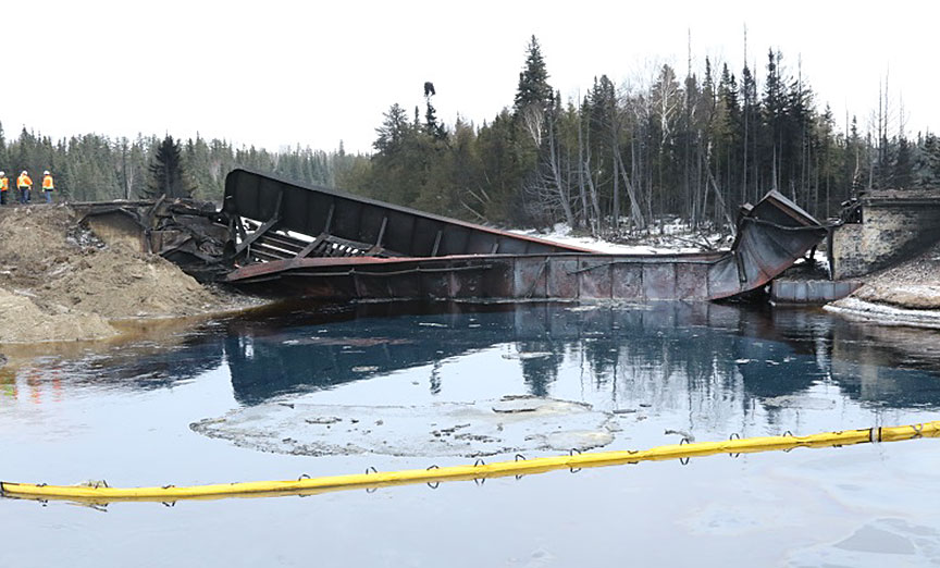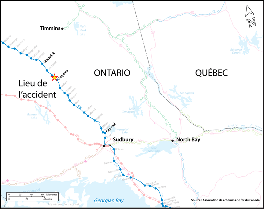 Le 7 mars 2015, vers 2 h 42 (heure normale de l'Est), le train-bloc de pétrole brut U70451-02 de la Compagnie des chemins de fer nationaux du Canada (le CN) circulait vers l'est à environ 43 mi/h dans la subdivision de Ruel du CN lorsqu'un freinage d'urgence provenant de la conduite générale s'est produit au point milliaire 88,70, près de Gogama (Ontario). Une inspection subséquente a permis de constater que les wagons 6 à 44 (39 wagons au total) avaient déraillé. Par suite du déraillement, environ 2,6 millions de litres de pétrole brut (UN 1267) ont été rejetés dans l'atmosphère, dans l'eau ou dans le sol. Le produit rejeté s'est enflammé et a causé des explosions, et du produit s'est écoulé dans la rivière Makami située à proximité. Le déraillement a détruit le pont du CN enjambant cette rivière (au point milliaire 88,70) et quelque 1000 pieds de voie. Il n'y a eu aucune évacuation ni aucun blessé.