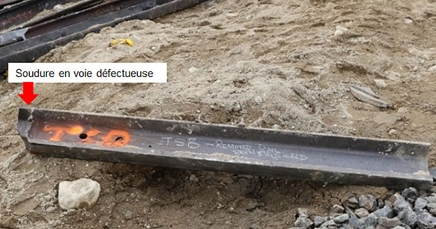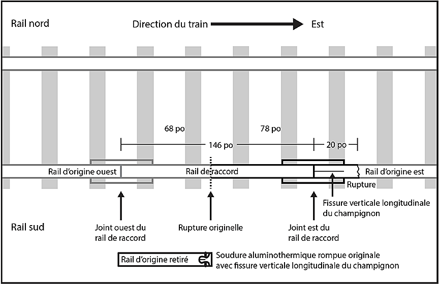 Un défaut de fissuration transversale (DFT) s'était amorcé à partir de criques du champignon au congé de roulement supérieur du champignon du rail. Avec le temps, la fissure avait connu une croissance normale jusqu'à occuper environ 20 % de la section transversale du champignon. La croissance récente de la fissure avait porté ce pourcentage à environ 85 % de la section transversale du champignon. Dès qu'il n'a plus été en mesure de supporter les charges de service, le reste du profil du rail a alors lâché sous la contrainte excessive.