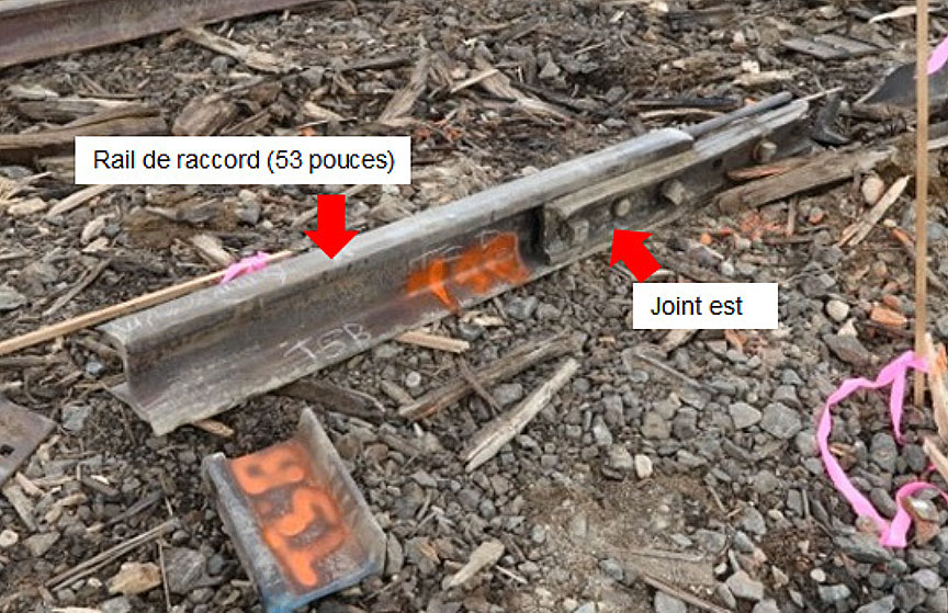 Un creux de surface de 1 pouce avait été détecté dans un joint isolant, qui affichait également un problème d'écrasement des abouts de rail. On a conclu que le soutien du joint était toujours conforme aux normes, mais qu'il se dégradait. Puisque le problème d'écrasement des abouts de rail et le creux de surface qui l'accompagnait ne dépassaient pas les limites définies dans le RSV ou les Normes de la voie – Ingénierie (NV) du CN, aucune mesure immédiate n'était requise et il n'était pas urgent d'effectuer cette réparation. Par la suite, le déraillement s'est produit lorsque les deux éclissent isolantes au point milliaire 111,7 se sont rompus sous la tête du train. La roue L4 du bogie arrière du 8e wagon est alors tombée entre les rails, ce qui a causé un surécartement des rails et le déraillement des wagons suivants.