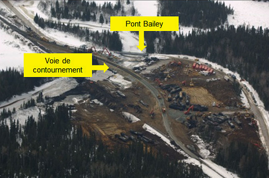 La voie de contournement enjambait la rivière Makami sur 5 ponceaux (figure 10) et est demeurée en service du 10 au 18 mars. Pendant cette période, environ 130 trains y ont roulé.