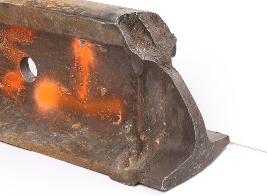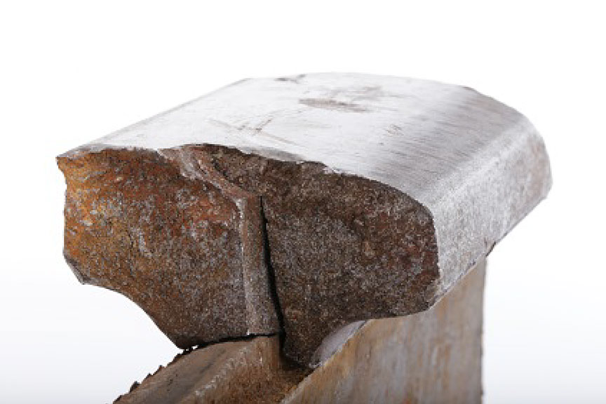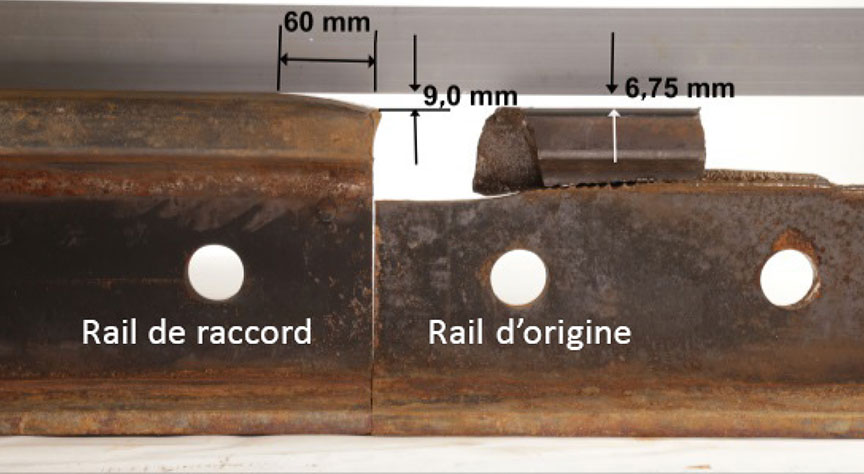 - Les surfaces exposées des rails rompus présentaient les caractéristiques d'une rupture récente par contraintes excessives. Il n'y avait pas de décoloration ni d'autres signes de fissure existante ou de rupture progressive.