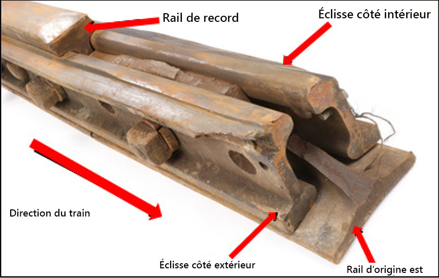- Le rail nord s'est rompu à proximité d'un affaissement localisé cerné de la surface de roulement causé par le développement et la propagation d'une FVLC. Cette dernière était occasionnée par une faiblesse préexistante du rail due à une fissuration de l'âme (c.-à-d. une ségrégation de l'axe longitudinal) (figure A1).