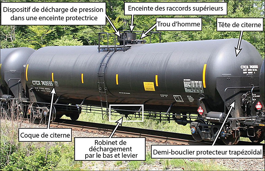 Tous les wagons-citernes en cause dans cet accident étaient de catégorie DOT-111A100W1 et étaient conformes à la norme sectorielle CPC-1232 de l'Association of American Railroads (AAR). Au moment de l'accident, il n'était pas requis que les wagons-citernes de catégorie DOT-111 et les wagons-citernes conformes à la norme CPC-1232 de l'AAR soient dotés de systèmes de protection thermique protégeant les citernes contre l'exposition aux feux en nappe ou de torche qui peuvent s'allumer pendant un accidentNote de bas de page 93.