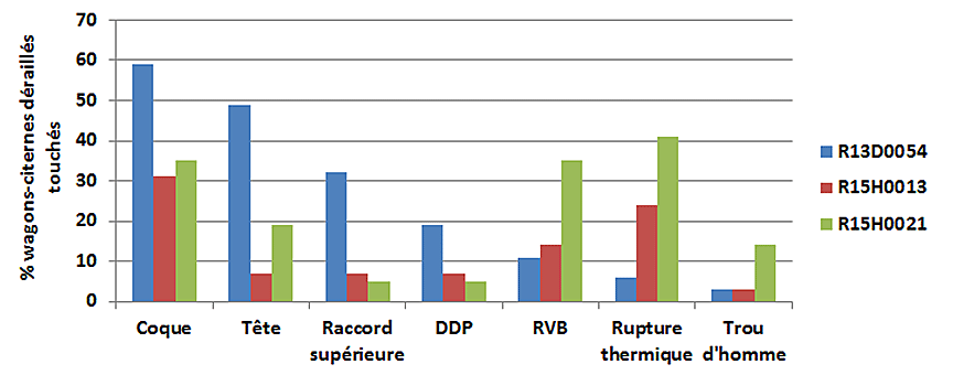 Aucun des wagons-citernes en cause n'était doté de systèmes de protection thermique. Pendant le déraillement, 2 wagons-citernes se sont rompus et ont rejeté plus de 50 000 gallons de pétrole brut. Dix-neuf des 27 wagons-citernes qui ont déraillé se sont empilés et ont contribué au feu en nappe qui a suivi le déraillement. Le feu en nappe a causé des ruptures thermiques de la coque de 13 wagons-citernes qui étaient demeurés intacts pendant le déraillement. Un seul des wagons-citernes se trouvant sur le front du feu en nappe n'a pas rejeté de produit. Les 8 autres wagons-citernes qui ont déraillé et qui se sont immobilisés d'un côté ou de l'autre du feu en nappe n'ont pas été considérablement endommagés et n'ont pas rejeté de produit.