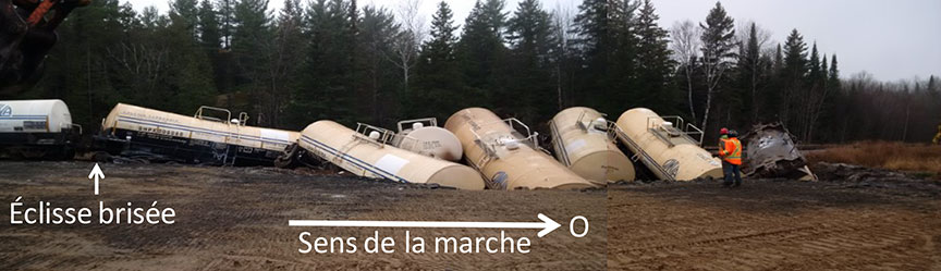 Les 3 locomotives de tête ont déraillé, se sont séparées du train et immobilisées à environ 115 pieds à l'ouest d'un groupe de wagons déraillés. Les 8 premiers wagons, tous des wagons-citernes, ont déraillé et se trouvaient à l'intérieur d'une brèche où la plateforme de la voie s'était affaissée. Cinq autres wagons, des wagons-tombereaux couverts qui occupaient les positions 24 à 28 depuis la tête du train, ont déraillé eux aussi. Aucune marchandise dangereuse n'a été en cause et personne n'a été blessé.