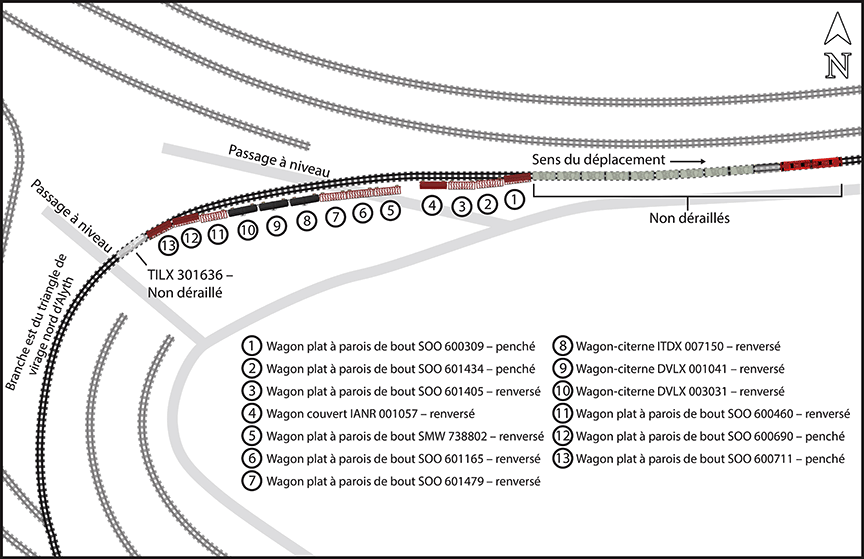 Immédiatement devant les 13 wagons déraillés se trouvaient 10 wagons (9 vides et 1 chargé) ainsi que les 2 locomotives (figure 4). Parmi les 13 wagons déraillés, il y avait 9 wagons plats vides à parois de bout et à poutre centrale, 1 wagon couvert chargé de haricots verts en conserve et 3 wagons-citernes vides (résidus) dont le dernier chargement avait été du soufre fondu. Les 2 premiers wagons déraillés étaient restés debout, mais en position penchée. Les 9 prochains wagons déraillés étaient renversés, et les 2 derniers wagons déraillés étaient restés debout, mais en position penchée.