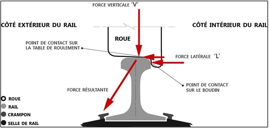 Une combinaison de forces latérales (L) et verticales (V) est présente à l'interface entre la roue et le rail (figure 5). Le rapport entre les forces latérales et verticales (L/V) fournit une indication de la probabilité de déraillement. En présence d'une grande force latérale et d'une force verticale limitée (ce qui est le cas, par exemple, pour un wagon vide), cette grande force latérale aura tendance à pousser le boudin de roue vers le haut et par-dessus la face intérieure du rail, ce qui entraîne un déraillement par chevauchement du rail.
