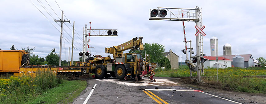 Lorsque la multi-grue se trouvait à environ 400 pieds (122 m) du passage à niveau, le signaleur a indiqué à l'opérateur de traverser le passage à niveau. Le signaleur a par la suite aperçu les lumières d'un véhicule routier qui s'approchait depuis l'ouest. Comme les phares du camion semi-remorque (camion) seraient devenu visibles à environ 1400 pieds (427 m) du passage à niveau, il y aurait eu suffisamment de temps au signaleur pour arrêter la multi-grue.