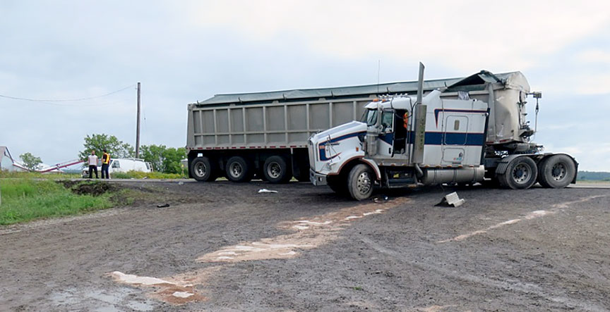 Le camion, constitué d'un tracteur et d'une remorque chargée de sable, était immobilisé sur la chaussée à environ 150 pieds (46 m) à l'est du passage à niveau. Le tracteur et la remorque sont demeurés attachés et étaient placés en portefeuille (figure 5). Le tracteur a été lourdement endommagé. L'avant de la cabine portait des marques d'impact au-dessus de la portière du passager. Le toit et une partie de l'arrière de la cabine ont été arrachés et projetés dans le fossé.