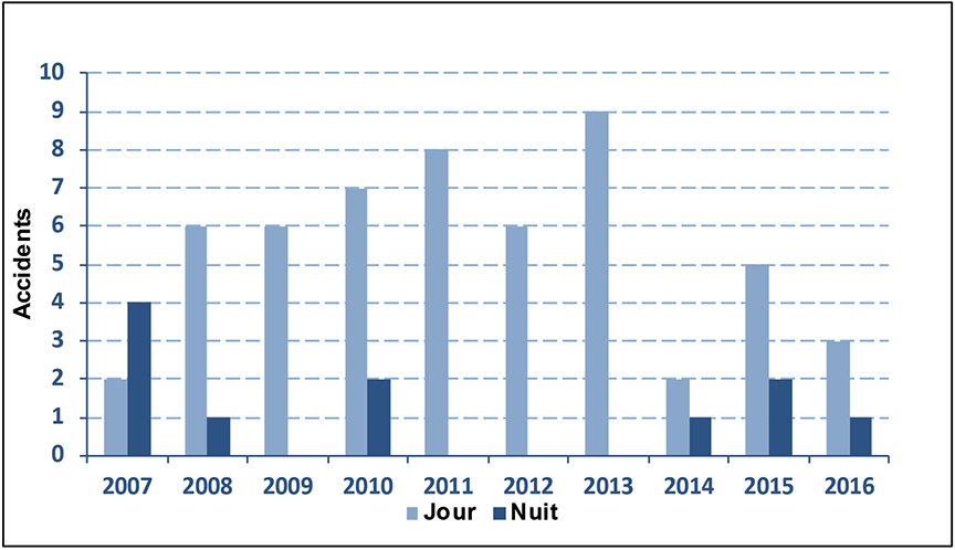 Selon la base de données des événements ferroviaires du BST, entre 2007 et 2016, il y a eu 65 événements mettant en cause un VE à un passage à niveau. Parmi ces événements, 39 se sont produits à des passages à niveau équipés de dispositifs d'avertissement et, à 28 reprises, il s'agissait de VE qui étaient isolés et ne pouvaient pas activer le dispositif d'avertissement des passages à niveau. Pendant cette période, 11 accidents sont survenus de nuit (figure 7). De plus, 2 accidents se sont produits lorsque des signaleurs assuraient une protection aux passages à niveau et que le dispositif d'avertissement n'était pas activé.