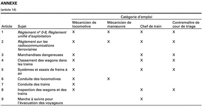 - Si le cadre réglementaire n'établit pas d'exigences suffisantes sur la formation, l'agrément et la connaissance du territoire des cadres ferroviaires qui conduisent des trains, les trains peuvent être conduits par des équipes formées de cadres n'ayant pas suffisamment d'expérience et de connaissance du territoire, ce qui augmente le risque de circulation ferroviaire non sécuritaire.