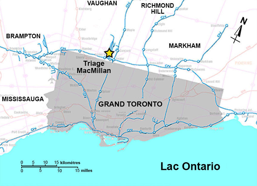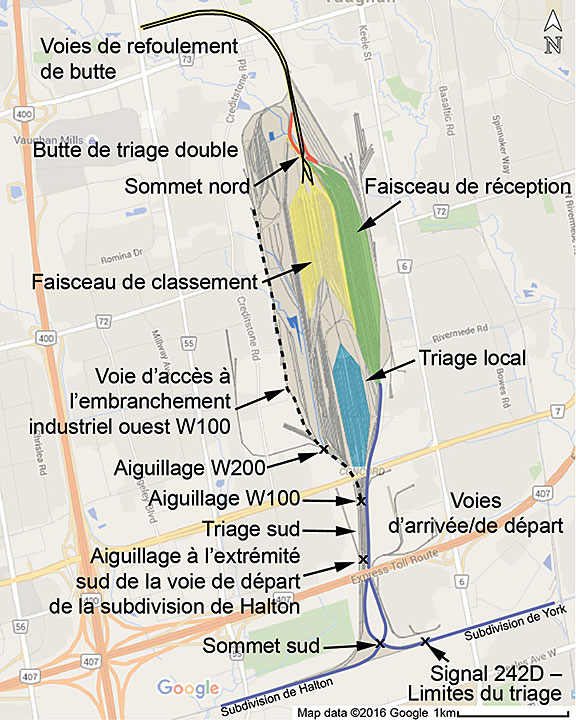 Le triage MacMillan (figure 2) est la principale gare de triage du CN dans l'est du Canada. On y pratique la manœuvre en palier ou « à la butte »Note de bas de page 2 pour répartir les wagons sur diverses voies en vue de leur placement dans différents trains. Les opérations au triage MacMillan sont assujetties à la règle 105 du Règlement d'exploitation ferroviaire du Canada (REFC). Les mouvements de trains peuvent circuler à une vitesse maximale de 15 mi/h, et ils doivent pouvoir s'arrêter en deçà de la moitié de la distance de visibilité. Le triage traite jusqu'à 1 million de wagons chaque annéeNote de bas de page 3. De 15 à 20 manœuvres sont exploitées chaque jour au triage. Jusqu'à 150 employés d'exploitation accomplissent simultanément différentes tâches (manœuvres locales, de triage et de triage à butte) au triage MacMillan. La plupart des manœuvres de triage MacMillan et certaines affectations de travail sont exploitées par 2 chefs de train qualifiés, chacun muni d'un appareil BeltpackNote de bas de page 4 du STL qui leur permet de commander la locomotive.