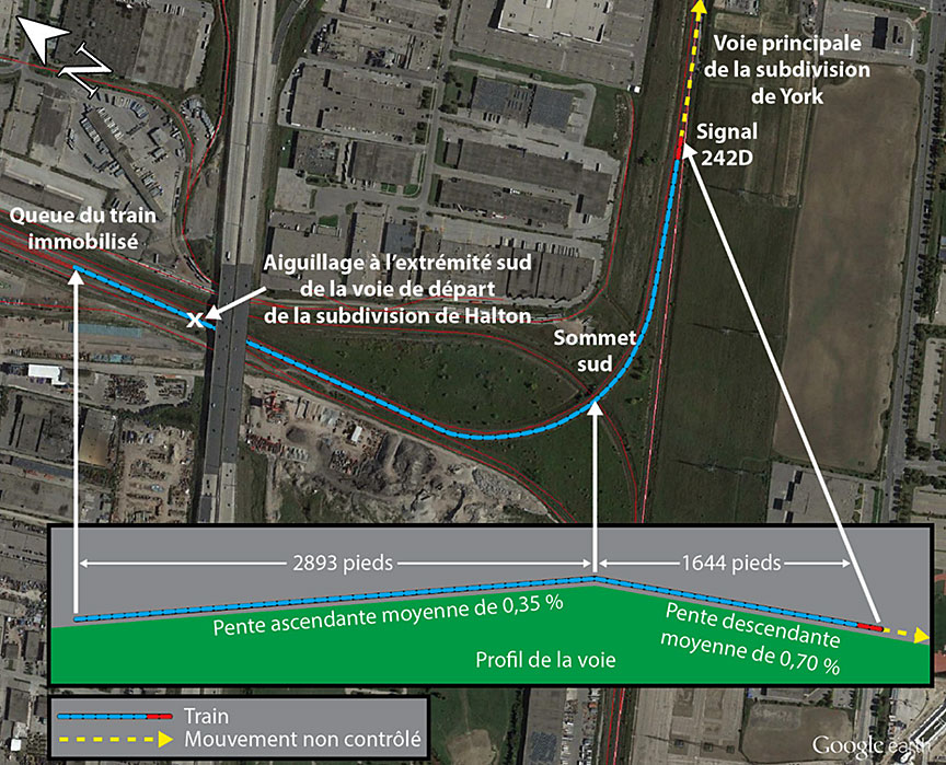 À 0 h 14 m 25 s, la manœuvre s'est immobilisée sur une pente ascendante au point milliaire 21,1 de la subdivision de York, avant les aiguillages de la subdivision de Bala.