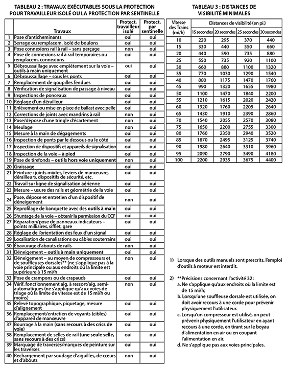 Annexe A – Tableaux des Instructions générales de l'Ingénierie de la Compagnie des chemins de fer du Canada indiquant les travaux exécutables sous la protection par sentinelle et les distances de visibilité minimales