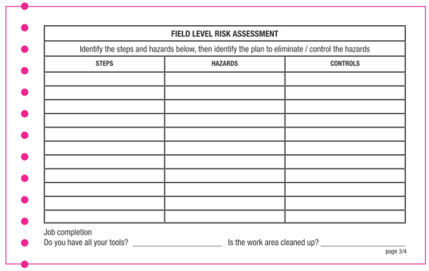 Par danger, on entend toute circonstance ou condition qui pose un risque d'incident. Avant d'entreprendre les travaux, le responsable d'un groupe de travail doit faire une évaluation des dangers ou tenir une séance de briefing pour tous ceux qui participeront à l'activité, pour chaque quart de travail ou tâche, et à mesure que changent les conditions ou circonstancesNote de bas de page 12.