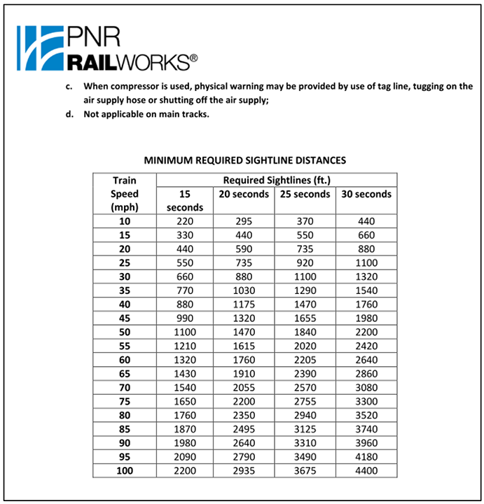Exemple : Des travailleurs utilisent la protection par sentinelle sur une voie où la vitesse maximale des trains est de 35 mi/h (56 km/h). Il a été établi qu'à partir de l'instant où l'arrivée d'un train lui est signalée, les travailleurs auront besoin de 5 secondes pour dégager la voie avec leurs outils et se mettre en sécurité. Ces 5 secondes viennent s'ajouter aux 15 secondes indiquées ci-dessus. Par conséquent, dans le tableau ci-après, la distance de visibilité à prévoir doit être cherchée dans la colonne « 20 secondes », où on voit que, pour une vitesse des trains de 35 mi/h (56 km/h), la distance de visibilité doit être de 1 030 pieds (314 mètres) dans les deux directions.