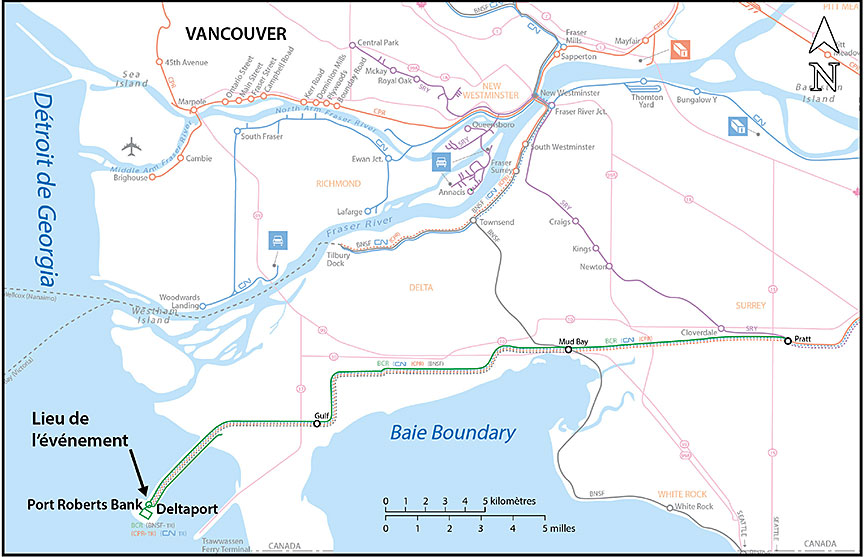 Le triage Roberts Bank se trouve sur la subdivision de Port entre les points milliaires 16,8 et 23,9. Ce triage dessert le port à charbon Westshore Terminals ainsi que Global Container Terminals. BCR est propriétaire de la subdivision de Port et du triage Roberts Bank. La subdivision de Port est contrôlée par un contrôleur de la circulation ferroviaire de BCR, tandis que toutes les opérations au triage sont contrôlées par le superviseur des opérations de triage de BCR. Le Règlement d'exploitation ferroviaire du Canada (REFC)Note de bas de page 6 régit à la fois le triage et la subdivision de Port.