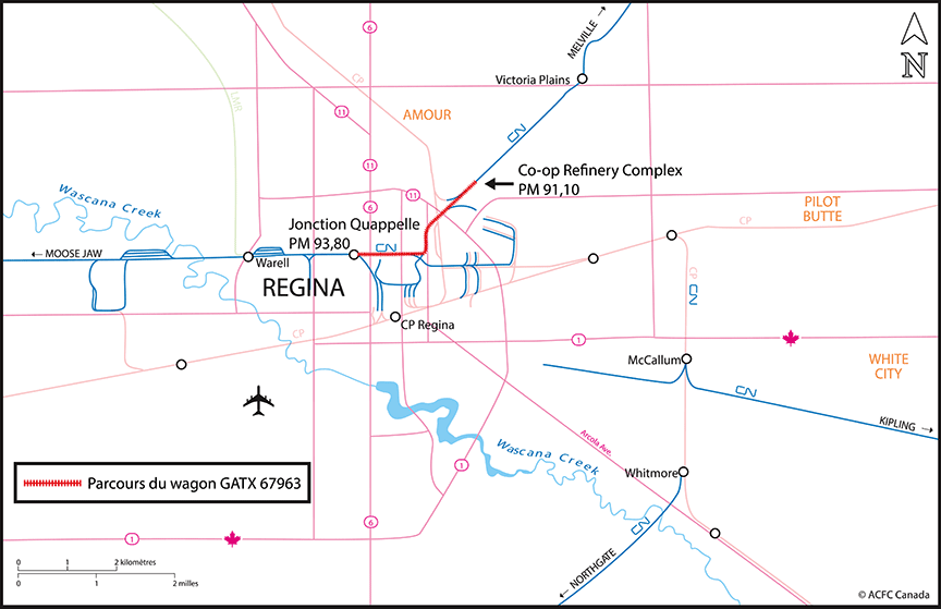 Le 1er mars 2016, vers 23 h 35, heure normale du Centre, l’équipe du quart de 22 h de Cando Rail Services affectée au Co-op Refinery Complex manœuvrait des wagons-citernes chargés de bitume au Co-op Refinery Complex de Regina (Saskatchewan). À 23 h 47, le wagon-citerne GATX 67963 est parti à la dérive et a parcouru quelque 2,7 milles (4,3 kilomètres), atteignant une vitesse de 19 mi/h. Le wagon a traversé 7 passages à niveau publics protégés par des dispositifs de signalisation automatique et 1 enclenchement ferroviaire (traversée) qui croisait la subdivision de Lanigan du Chemin de fer Canadien Pacifique. Il a fini par s’arrêter dans la ville de Regina. Personne n’a été blessé et aucune marchandise dangereuse n’a été en cause.