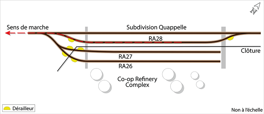 L'affectation devait manœuvrer des wagons-citernes chargés au CRC. L'affectation est arrivée sur les lieux du CRC et l'équipe a retiré tous les dérailleurs qui protégeaient les voies de chargement. L'affectation est ensuite entrée dans le CRC et a commencé à faire des manœuvres. L'équipe a tiré 9 wagons qui se trouvaient sur la voie RA26 dans l'intention de les grouper en lots en fonction des points de destination, en utilisant les voies RA26 et RA28 ainsi que la voie de subdivision du CN (figure 2). L'équipe a laissé le wagon-citerne GATX 67963, ne contenant pas de marchandise dangereuse (chargé de bitume), sur la voie RA28 et une rame de 5 wagons sur la voie de subdivision adjacente. Tous ont été immobilisés par serrage d'urgence des freins à air.