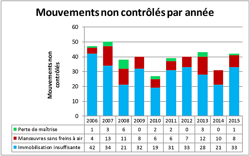 Entre 2006 et 2015 inclusivement, 74 % (294 sur 397) de tous les mouvements non contrôlés au Canada étaient directement liés à une immobilisation insuffisante. Environ 17 % (68 sur 397) des événements ont eu une incidence sur la voie principale. Depuis 1994, le BST a enquêté sur 19 événements (y compris celui à l'étude) mettant en cause du matériel roulant à la dérive. Un certain nombre d'entre eux ont été lourds de conséquences, y compris des morts.