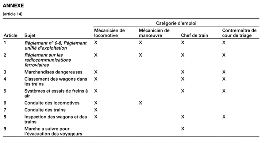 - Les sujets requis pour accéder à un poste d'une catégorie d'emploi auprès d'une compagnie de chemin de fer sont ceux indiqués par un « X » à l'annexe, abstraction faite des sujets ou questions qui traitent de matériel que la compagnie de chemin de fer n'utilise pas.