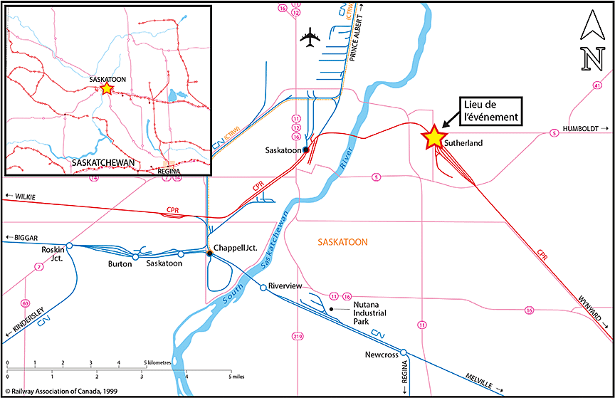 Le 27 mars 2016, la manœuvre de formation (la manœuvre) au système de télécommande de locomotive (STL) 2300 du Chemin de fer Canadien Pacifique (CP) effectuait des manœuvres de triage à l'extrémité est du triage Sutherland du CP à Saskatoon (Saskatchewan) (figure 1). Au moment de l'événement, la manœuvre était composée de 2 locomotives qui déplaçaient 16 wagons-trémies couverts vides. La locomotive CP 4441 était réglée pour être conduite à l'aide du STL. La manœuvre mesurait environ 1000 pieds de long et pesait environ 800 tonnes.