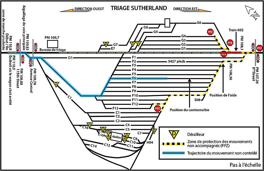 Lorsque la manœuvre s'est arrêtée, le wagon EFCX 604991, dont la mâchoire était déjà ouverte, s'est dételé et s'est mis à rouler de façon non contrôlée sur toute la longueur de la voie F6, a franchi l'aiguillage F6 ouest qui était orienté en sens inverse, a roulé le long de la voie d'accès à l'extrémité ouest du triage F et est sorti du triage pour s'engager sur la voie principale. Ni l'équipe de manœuvre ni le CTA, qui se trouvait dans le bureau de triage, ne savait qu'un wagon s'était dételé de la rame de 16 wagons sur la voie F6.