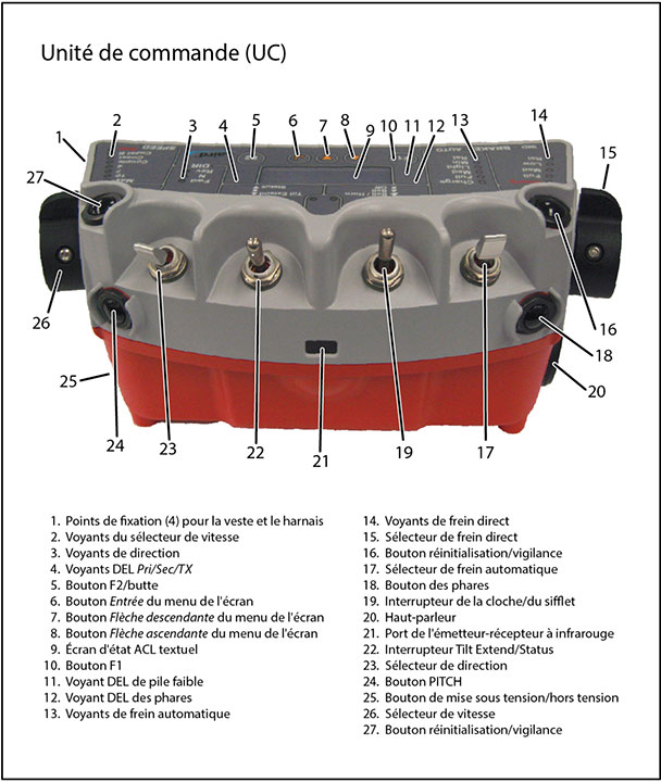 - une unité de commande de l'opérateur (UC), communément appelée Beltpack. L'UC est un appareil léger de télécommande qui s'attache au gilet de sécurité de l'opérateur.