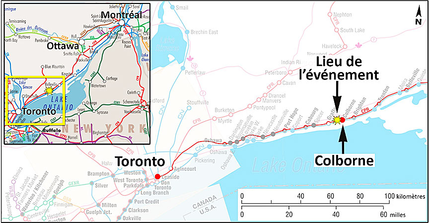 Le 13 février 2017, vers 5 h 55Note de bas de page 1, le train de marchandises 142-12 du Chemin de fer Canadien Pacifique (CP) a quitté Toronto (Ontario) et a emprunté la subdivision de Belleville à destination de Montréal (Québec; figure 1). Le train comptait 2 locomotives de tête et 73 wagons. Il pesait 8520 tonnes courtes et mesurait 8486 pieds. L'équipe de train se composait de 1 mécanicien de locomotive et de 1 chef de train.