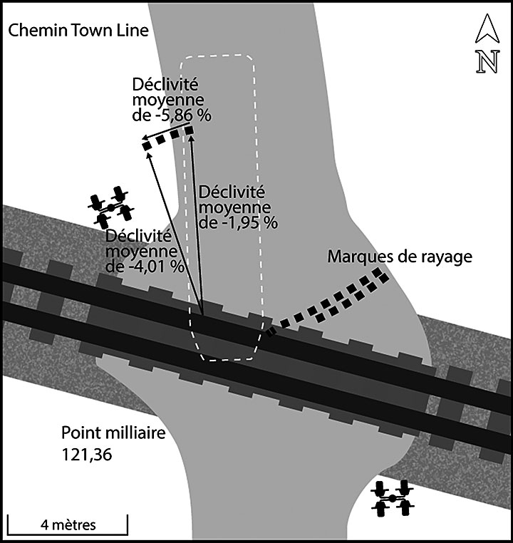 Dans son Règlement sur les passages à niveau (novembre 2014), Transports Canada (TC) ne définit pas de déclivité maximale pour les abords routiers des passages à niveau qui existaient avant l'entrée en vigueur du règlement. Dans le cas des nouveaux passages à niveau, le règlement cite la section 6 des Normes sur les passages à niveau (juillet 2014), lesquelles indiquent notamment ce qui suit :