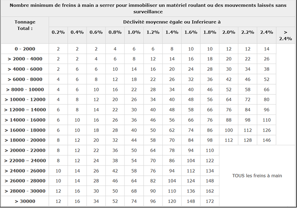 Selon le tableau intitulé « Nombre de freins à main à serrer pour immobiliser un matériel roulant ou des mouvements laissés sans surveillance » de la règle 112 du REF (annexe A), un train de 20 000 tonnes laissé sur une pente de 0,4 % requiert un minimum de 12 freins à main pour être sécurisé.