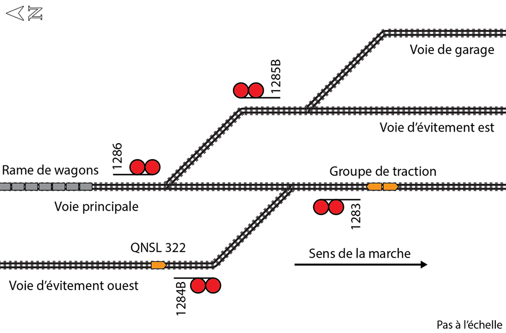 De sa position au sud du signal 1283, le ML était en mesure de voir l'indication de ce dernier et de déplacer le groupe de traction en marche arrière vers la locomotive QNSL 322, située sur la voie d'évitement ouest.