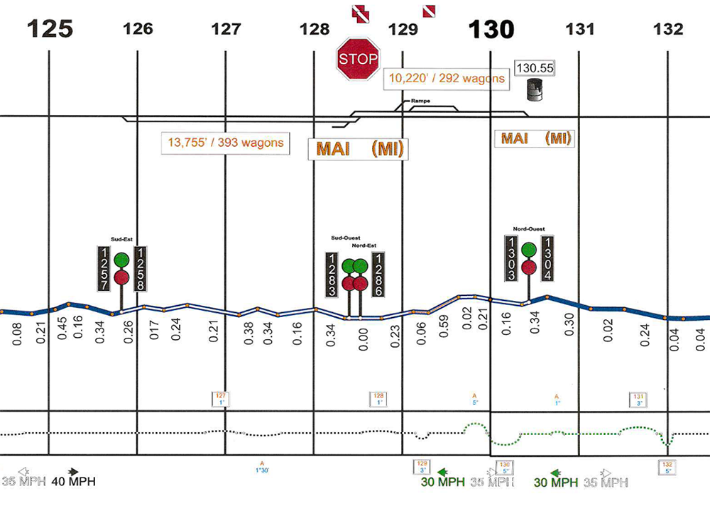 La gare de Mai est environ à mi-chemin entre Sept-Îles (Québec) et Labrador City (Terre-Neuve-et-Labrador). À cet endroit, QNS&L maintient un camp pour les équipes d'ingénierie et effectue les changements d'équipe de train. La gare s'étend sur une longueur d'environ 4,5 milles et est composée d'une voie principale simple et de 2 voies d'évitement situées de chaque côté de la voie principale. Chaque voie d'évitement est munie d'un embranchement. Entre l'extrémité nord et l'extrémité sud de la gare, QNS&L a identifié 16 changements à la déclivité de la voie qui sont à des intervalles irréguliers ainsi que des pentes allant jusqu'à 0,59 %. Entre le point milliaire 129,7 et le point milliaire 128,6 (signal 1286), la voie principale a une pente descendante d'environ 0,4 % vers le sud (figure 3).