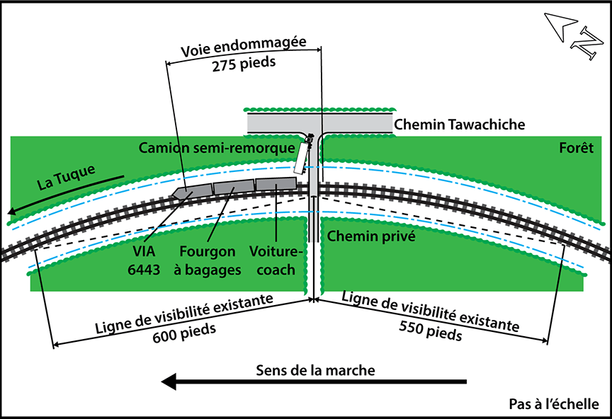 Vers 12 h 30, le train roulait vers l'ouest à 39 mi/h et s'approchait d'un passage à niveau privé au point milliaire 77,2 de la subdivision de La Tuque de la Compagnie des chemins nationaux du Canada (CN) (figure 1). Les phares avant et de fossé de la locomotive étaient allumés à pleine intensité. Étant donné qu'il s'agissait d'un passage à niveau privé, le train n'était pas tenu de siffler à l'approche du passage à niveau. Alors que le train se trouvait à environ 550 pieds à l'est du passage à niveau, le MAC a aperçu un camion semi-remorque (camion) chargé de billots qui franchissait le passage à niveau. Il a immédiatement appliqué le frein d'urgence et actionné le sifflet et la cloche. Le train n'a pas pu s'immobiliser avant le passage à niveau et a heurté la partie arrière de la remorque environ 9 secondes plus tard.
