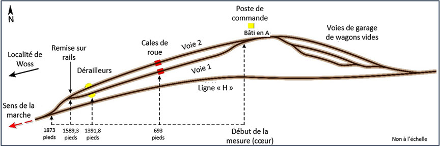 Des dérailleursNote de bas de page 4 en place à l'extrémité ouest des voies 1 et 2 du Centre ont pour but d'empêcher des wagons à la dérive de sortir du Centre. La déclivité de ces 2 voies (entre le bâti en A et les dérailleurs) dans le Centre de rechargement de Woss varie entre 0,3 % et 2,2 %.