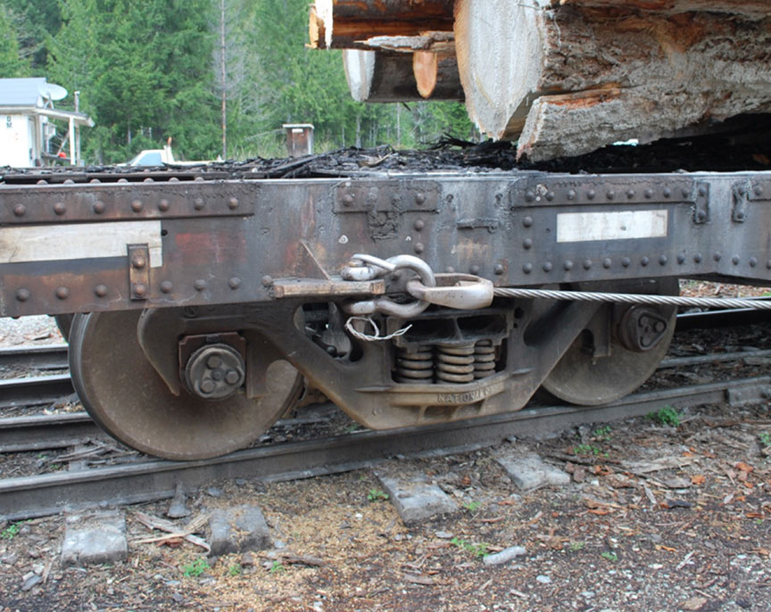 Chaque wagon en service grumier est muni d'un chevalet d'arrimage soudé sur son côté (figure 3). Un dispositif avec chape de réglage et axe est utilisé pour attacher le câble de treuil au chevalet d'arrimage. Une fois les wagons en position de chargement, des cales de roue (figure 4 et figure 5) et des freins à main sont utilisés pour les immobiliser au sommet des voies 1 et 2, près du bâti en ANote de bas de page 2. Un opérateur affecté au rechargement actionne le treuil depuis le poste de commande. Un responsable du chargement s'occupe d'attacher et de détacher le câble, de manœuvrer et d'immobiliser les wagons.