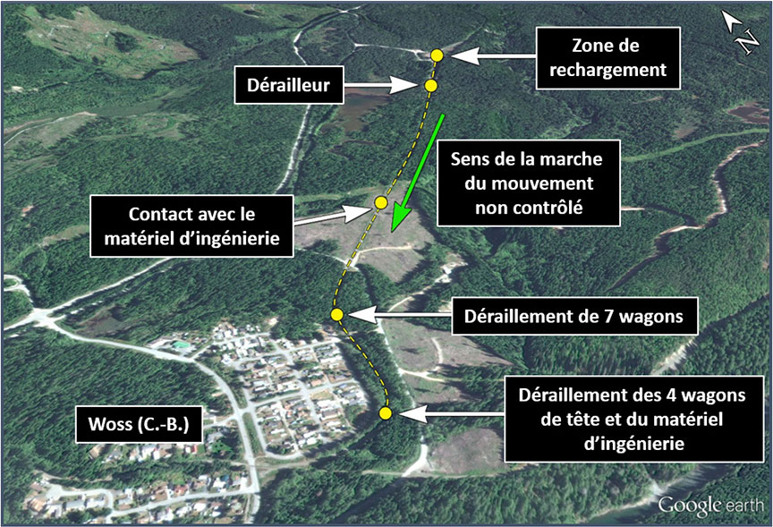 Le 20 avril 2017, vers 8 h 30, heure avancée du Pacifique, une rame de 11 wagons chargés de grumes a roulé à la dérive hors du Centre de rechargement de Woss exploité par Western Forest Products Inc. près de Woss (Colombie-Britannique). Les wagons à la dérive ont roulé sur un dérailleur, se sont remis sur les rails à un aiguillage et ont continué leur route sur la voie de la ligne « H », dans une pente descendante, puis ont heurté du matériel d’ingénierie à bord duquel se trouvaient des employés sur la voie. Les 11 wagons et 2 véhicules du matériel d’ingénierie ont déraillé. Trois employés des services d’ingénierie ont subi des blessures mortelles et 2 autres ont été grièvement blessés.
