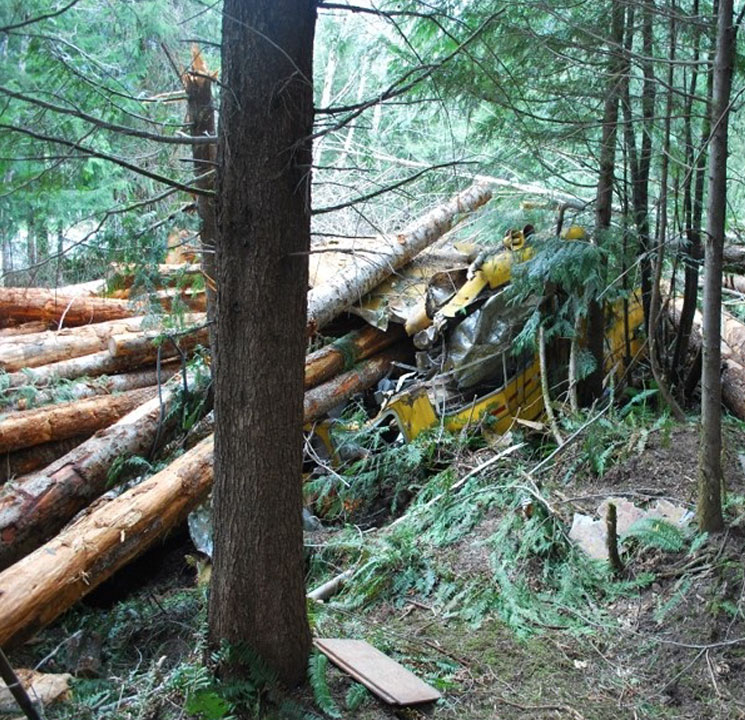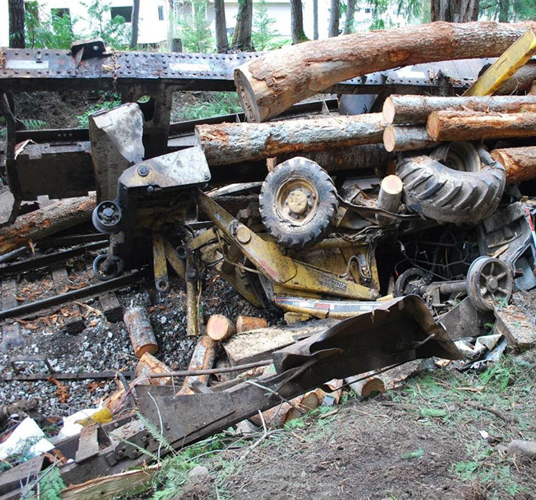Au second point de déraillement, les 4 °wagons restants, la draisine et la pelle rétrocaveuse avaient déraillé sur le côté haut, dans le corps de la courbe à droite de 14 °. À cet endroit, la voie s’était déplacée vers l’intérieur de la courbe, ce qui est compatible avec un basculement des wagons vers le côté haut. Les wagons avaient perdu leurs chargements de grumes; la pelle rétrocaveuse et la draisine ont été ensevelies sous une partie des grumes (figure 9). Le poids des grumes et les forces d’impact lors de la collision et du déraillement ont gravement endommagé la draisine et la pelle rétrocaveuse (figure 10).