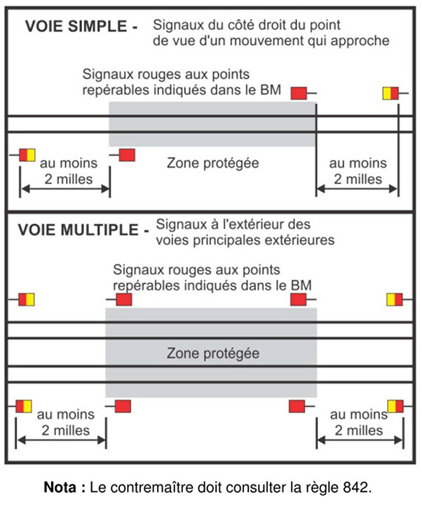Dans la figure A1 ci-dessus, pour une voie simple, les signaux rouges sont illustrés aux endroits indiqués dans le BM, et les drapeaux à bande jaune sur bande rouge sont placés au moins 2 milles avant les drapeaux rouges. Les drapeaux sont placés du côté droit de la voie pour être vus distinctement par l'équipe d'un mouvement qui approche. Dans le cas de voies multiples, les signaux rouges sont illustrés aux endroits indiqués dans le BM, et les drapeaux à bande jaune sur bande rouge sont placés à au moins 2 milles avant les drapeaux rouges. Les drapeaux doivent être placés à l'extérieur des voies principales les plus à l'extérieur.