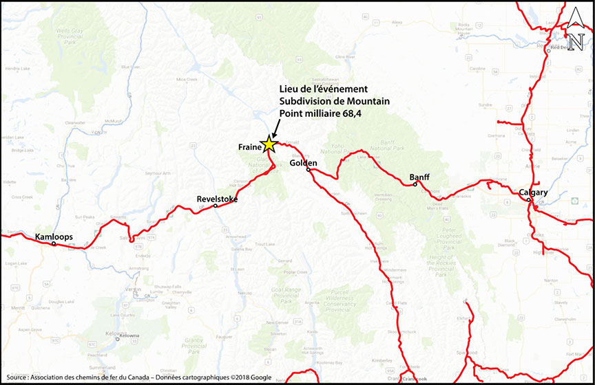 Le 31 octobre 2017 à 3 h 52Note de bas de page 1, le train de marchandises 868-078 du Chemin de fer Canadien Pacifique (CP) a quitté Revelstoke (Colombie-Britannique) vers l'est à destination de Golden (Colombie-Britannique) (figure 1). Le train était composé de 2 locomotives de tête, 1 locomotive télécommandée en milieu de train, 1 locomotive télécommandée en queue de train et 152 wagons vides. Il pesait 3290 tonnes et mesurait 8363 pieds. L'équipe de train se composait de 1 mécanicien de locomotive et de 1 chef de train. Les 2 employés étaient qualifiés pour leur poste respectif, connaissaient bien le territoire et satisfaisaient aux exigences établies de repos et d'aptitude au travail.
