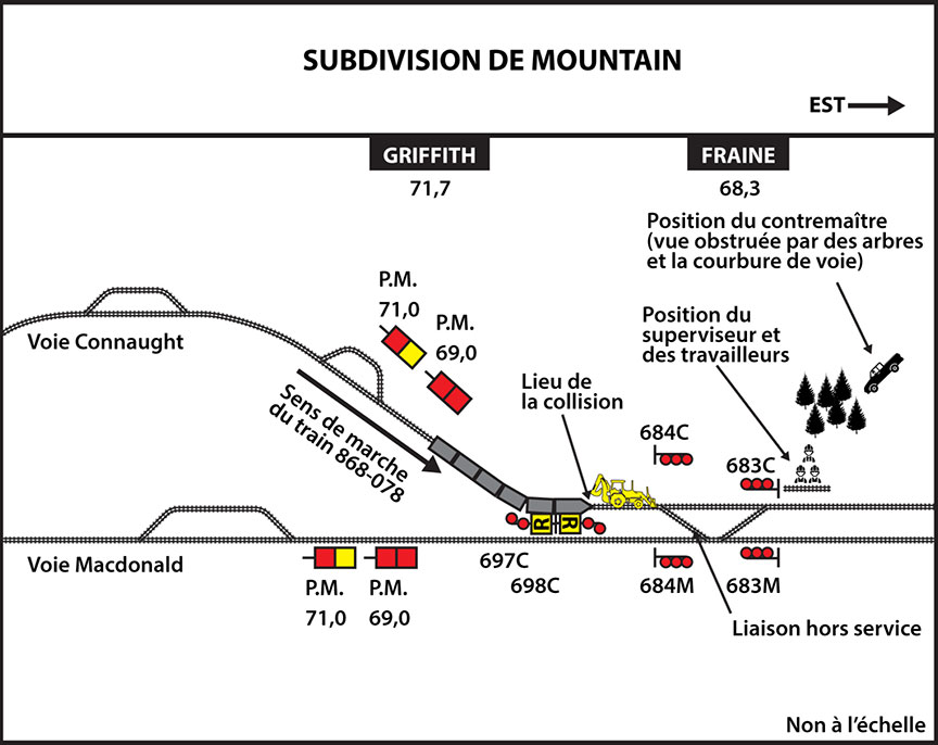 Environ 1 heure avant l'événement, après avoir vérifié l'affichage de la voie sur son ordinateur portable, le contremaître a remarqué que le train 868-078 vers l'est approchait de la zone de travaux sur la voie Connaught. Le contremaître a averti les employés sous sa surveillance directe, les employés qui avaient reçu la protection de sous-contremaître, ainsi que le superviseur, qu'un train vers l'est allait circuler dans la zone de travaux sur la voie Connaught.