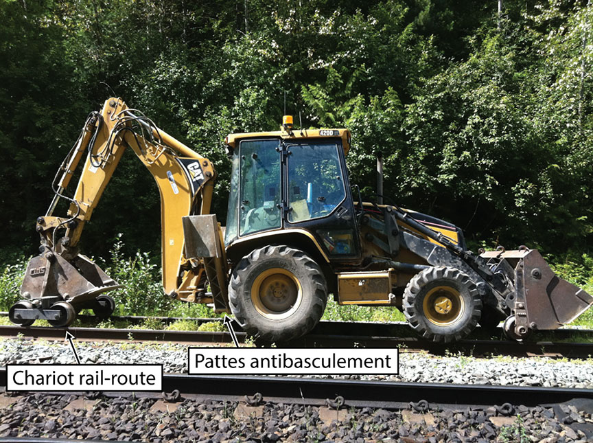 Travaillant sous la direction du superviseur, l'opérateur de rétrocaveuse effectuait des travaux de nettoyage le long des voies et entre celles-ci, à quelque 1000 pieds à l'ouest des liaisons. La rétrocaveuse était reliée à un chariot muni d'un dispositif rail-route pour faciliter son déplacement sur la voie (figure 4).
