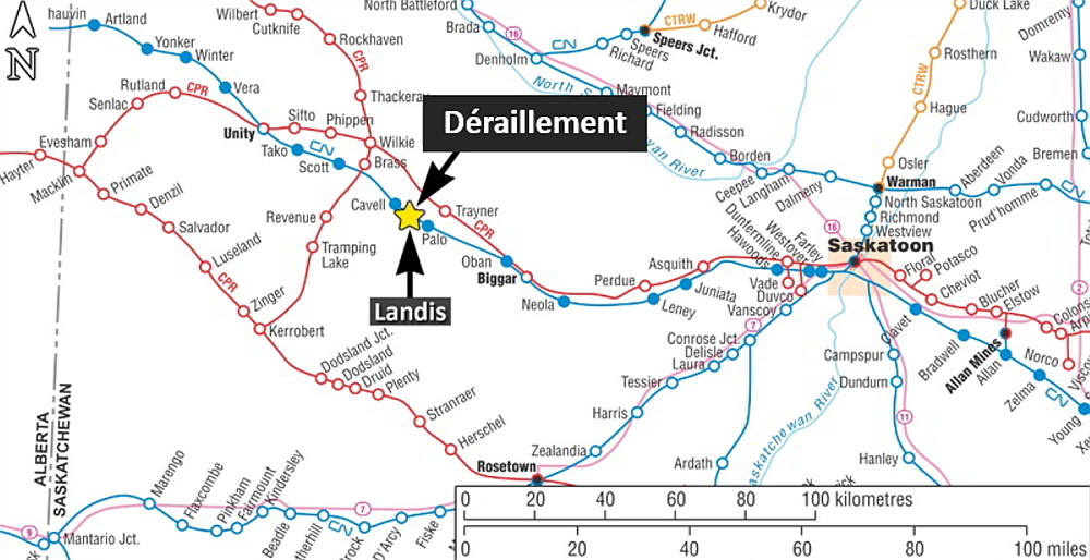Vers 9 h 15, en traversant Landis (Saskatchewan) à 51 mi/h, le train est passé en freinage d'urgence intempestif. Une fois le train immobilisé, l'équipe l'a inspecté et a déterminé que les 2 locomotives télécommandées en milieu de train, aux positions 79 et 80 Note de bas de page 2, et 41 wagons-trémies couverts chargés de graines de canola, aux positions 52 à 92, avaient déraillé et gisaient en diverses positions le long de l'emprise (figure 2). On a déterminé que le point de déraillement se trouvait au point milliaire 24,30 de la subdivision de Wainwright.