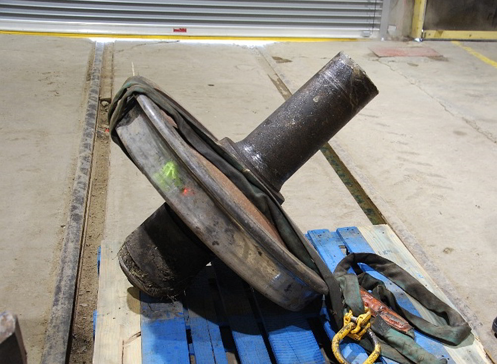 Quand un essieu monté est envoyé à l'atelier de roues pour une remise à neuf, si la table de roulement des roues est trop usée pour permettre un reprofilageNote de bas de page 4, les roues sont retirées de l'essieu au moyen d'une presse, et l'essieu est alors soumis à une inspection. Si l'essieu satisfait aux critères de remise à neuf, il est admissible comme essieu usagé non monté.