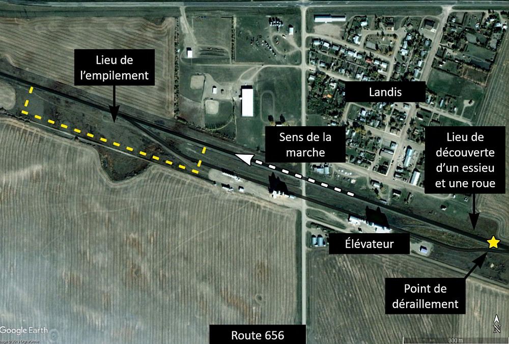À partir d'environ 20 pieds à l'ouest de l'aiguillage est de la voie de Landis Producer Co-op, il y avait des marques d'abrasion fraîches sur les traverses entre les rails, ce qui suggère que l'essieu s'est rompu à cet endroit. Après la rupture de l'essieu et le déraillement de l'essieu monté, le bogie arrière du wagon CEFX 350816 a été traîné sur environ 4000 pieds jusqu'au lieu de l'empilement principal des wagons déraillés (figure 3).