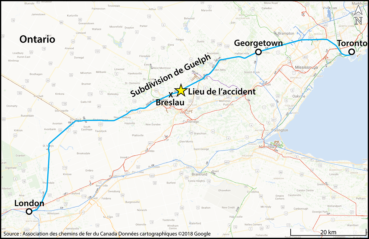 Le 8 février 2018, vers 11 hFootnote 1, le train de voyageurs no 85 de VIA Rail Canada inc. (VIA) a quitté la gare Union de Toronto (Ontario) à destination de London (Ontario). Le train était formé de 1 locomotive de tête et 2 voitures-coachs. Il pesait quelque 252 tonnes et mesurait environ 227 pieds de long. L'équipe de train était formée de 1 mécanicien de locomotive aux commandes et 1 mécanicien de locomotive responsable. Les 2 étaient qualifiés pour leurs postes respectifs, répondaient aux normes d'aptitude au travail et de repos et connaissaient bien le territoire. Le train transportait 56 voyageurs.