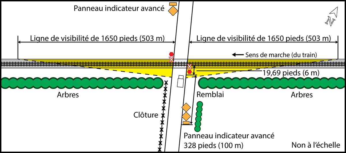 Pour les véhicules arrêtés à un passage à niveau passif avec panneau d'arrêt qui traversent une voie ferrée dont la vitesse maximale autorisée est de 70 mi/h, les Normes sur les passages à niveau (2014) de Transports Canada exigent que la ligne de visibilité minimale soit d'environ 1100 piedsFootnote 5.
