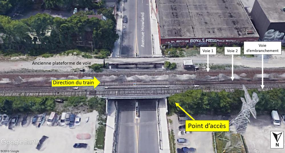 Peu après 1 h 15, les 2 adolescentes, qui habitaient dans les environs, marchaient du côté sud sur l'avenue Howland et ont aperçu le train 651 qui roulait lentement vers l'ouest. Elles sont montées sur le remblai immédiatement au nord-ouest du passage supérieur de l'avenue Howland et sont entrées sur l'emprise ferroviaire sans y être autorisées, par une ouverture entre la clôture et la barrière du passage supérieur (figure 1). Les adolescentes, qui étaient intoxiquées, sont montées sur le train. Elles avaient l'intention d'en descendre au saut-de-mouton de la rue Christie, situé à quelque 2600 pieds à l'ouest du saut-de-mouton de l'avenue Howland, et de là, se rendre au parc Christie Pits.